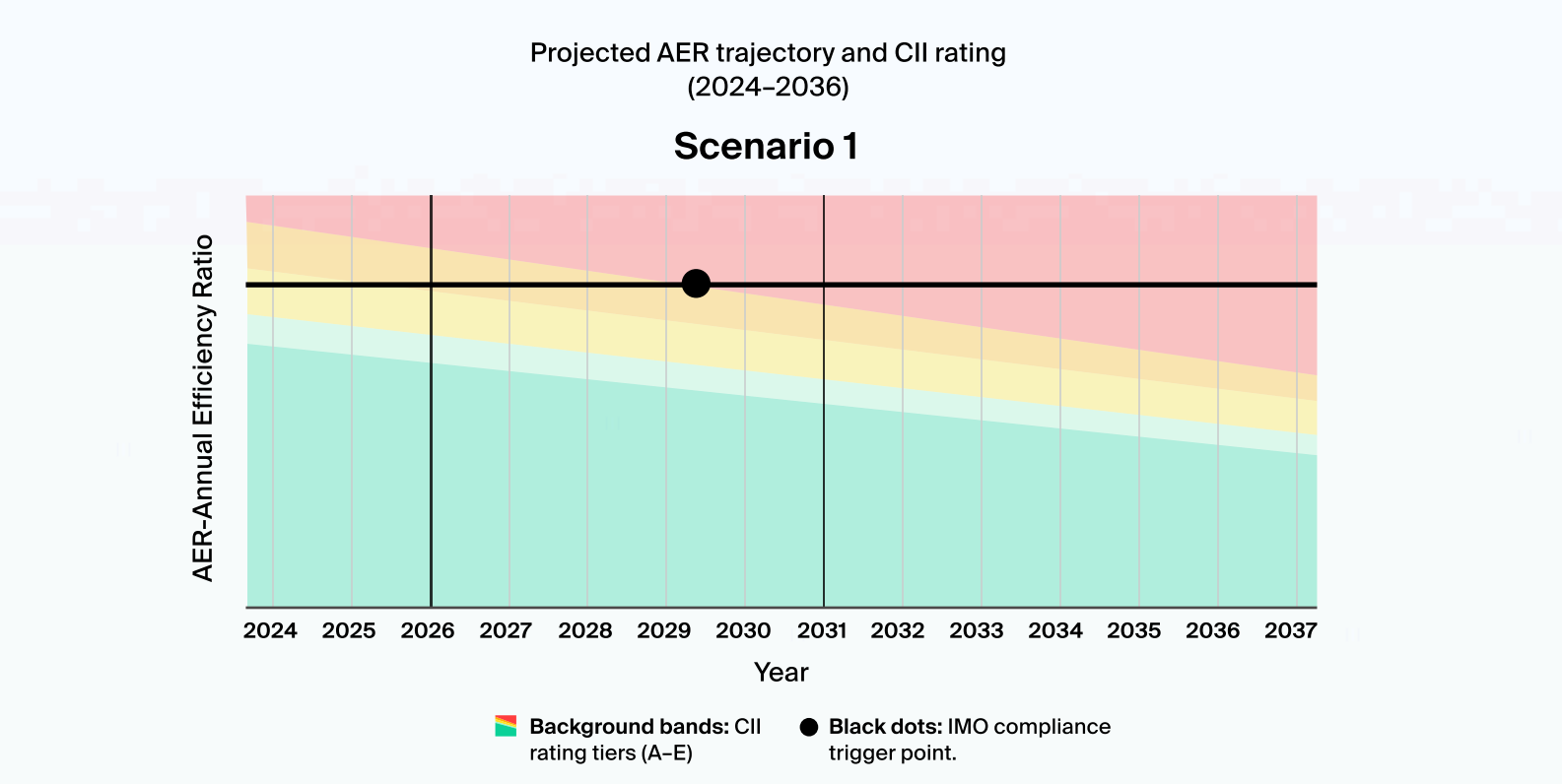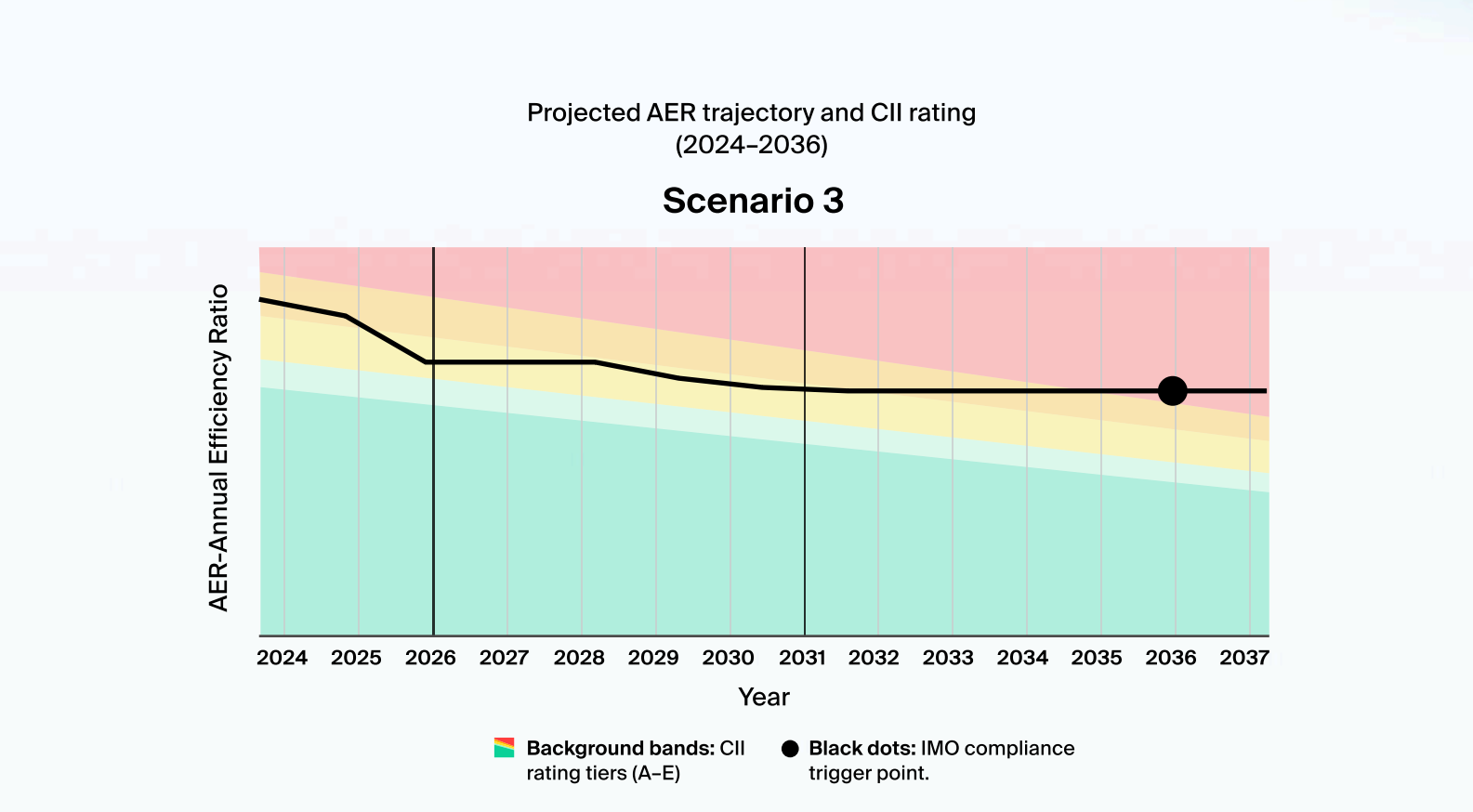 The study combined baseline fuel consumption and AER analysis with long-term CII modelling, supported by a detailed review of the vessel’s operational profile and constraints. This enabled clear identification of the efficiency gap and the boundaries for retrofit implementation.