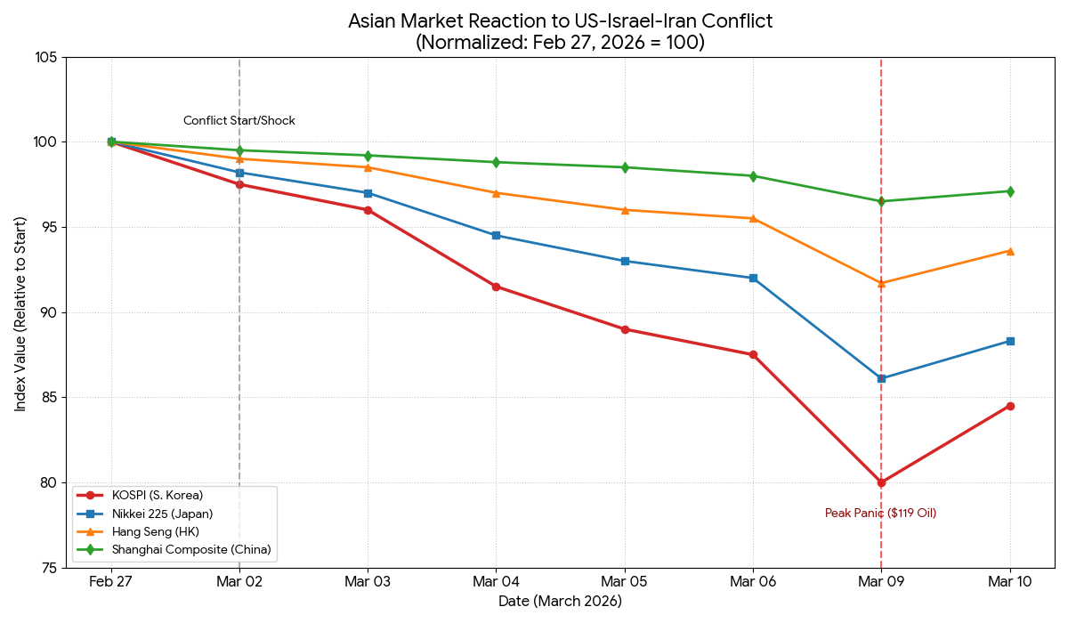 Asian markets breathed a collective, if shaky, sigh of relief yesterday. As of this morning, Brent crude has plummeted to $85.19 per barrel—a staggering $35 drop from yesterday’s peak of nearly $120 [ICE Futures/Trading Economics, 2026]. In response, the KOSPI has surged 5.4% and the Nikkei 225 is up 2.9%, clawing back ground lost during the peak of the Musaffah 2 crisis [Associated Press/Bernama, 2026].